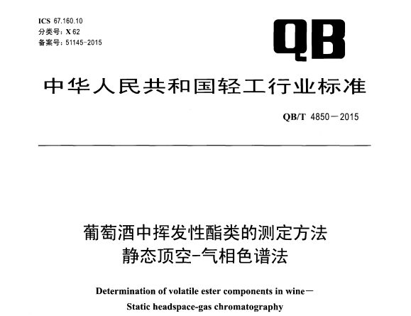 QBT 4850-2015 葡萄酒中揮發(fā)性酯類的測(cè)定方法 靜態(tài)頂空-氣相色譜法 適用范圍本標(biāo)準(zhǔn)規(guī)定了葡萄酒中揮發(fā)性酯類的靜態(tài)頂空-氣相色譜法的原理、試劑和材料、儀器和設(shè)備、分析步驟... 更新日期:2020-05-09 下載包(1)