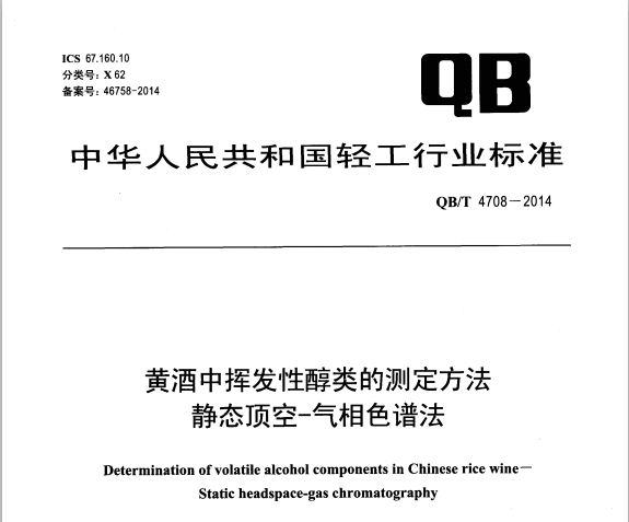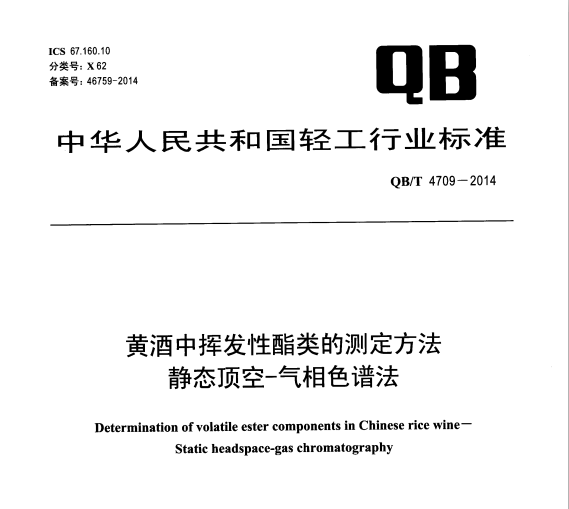 QBT 4709-2014 黃酒中揮發(fā)性酯類的測(cè)定方法 靜態(tài)頂空-氣相色譜法 QB/T4709-2014黃酒中揮發(fā)性酯類的測(cè)定方法靜態(tài)頂空-氣相色譜法 本標(biāo)準(zhǔn)規(guī)定了黃酒中揮發(fā)性... 更新日期:2020-05-09 下載包(1)